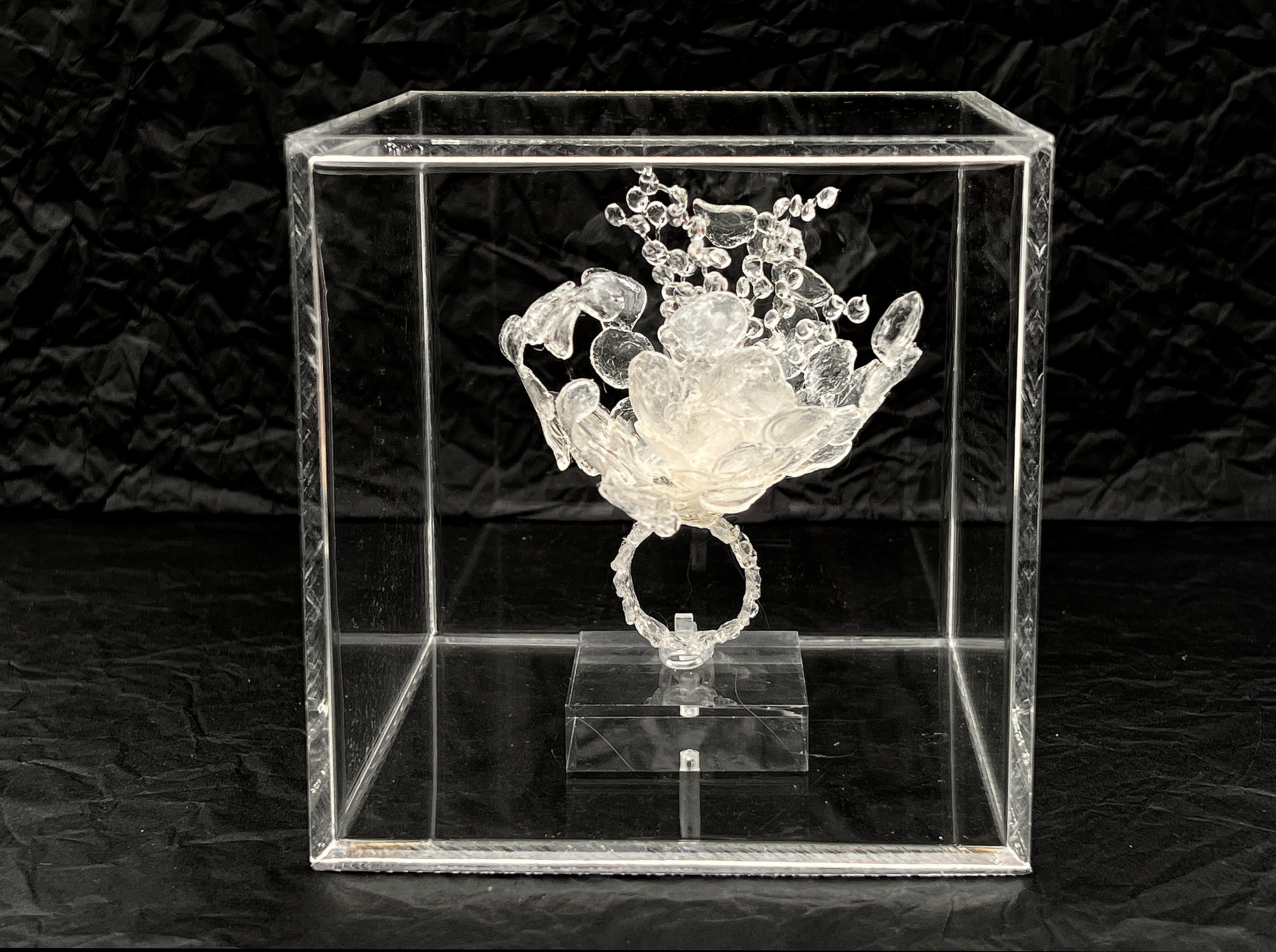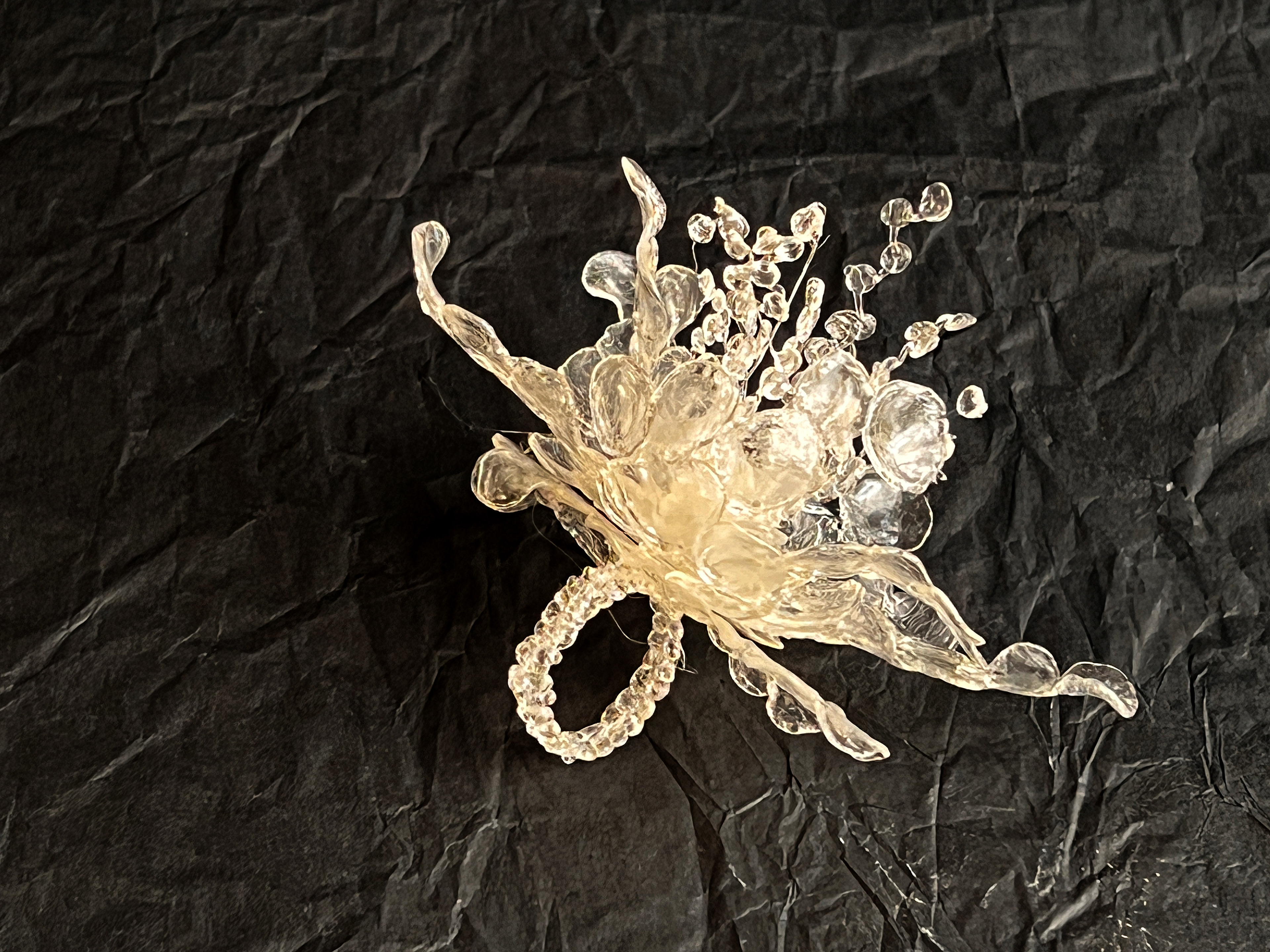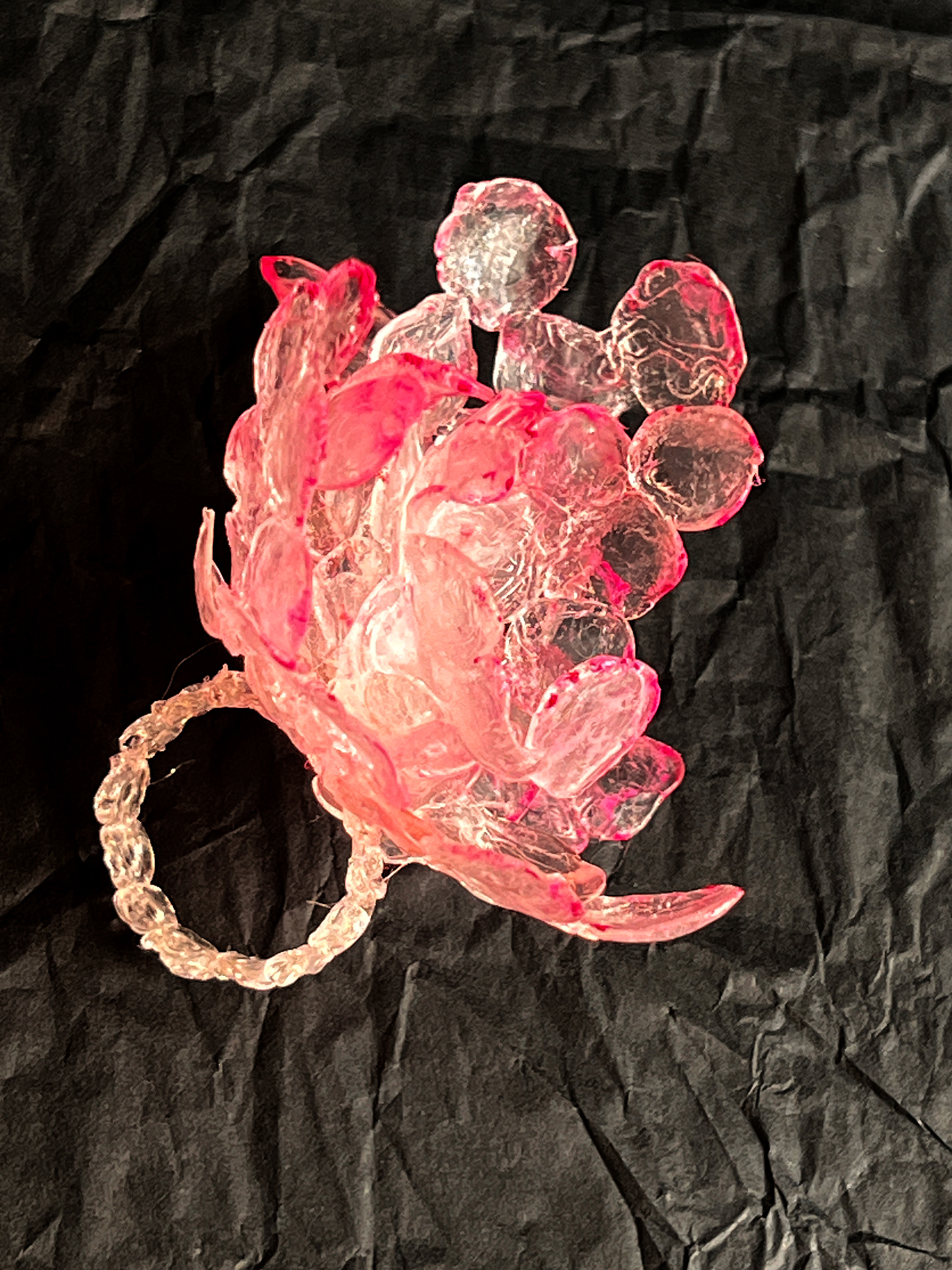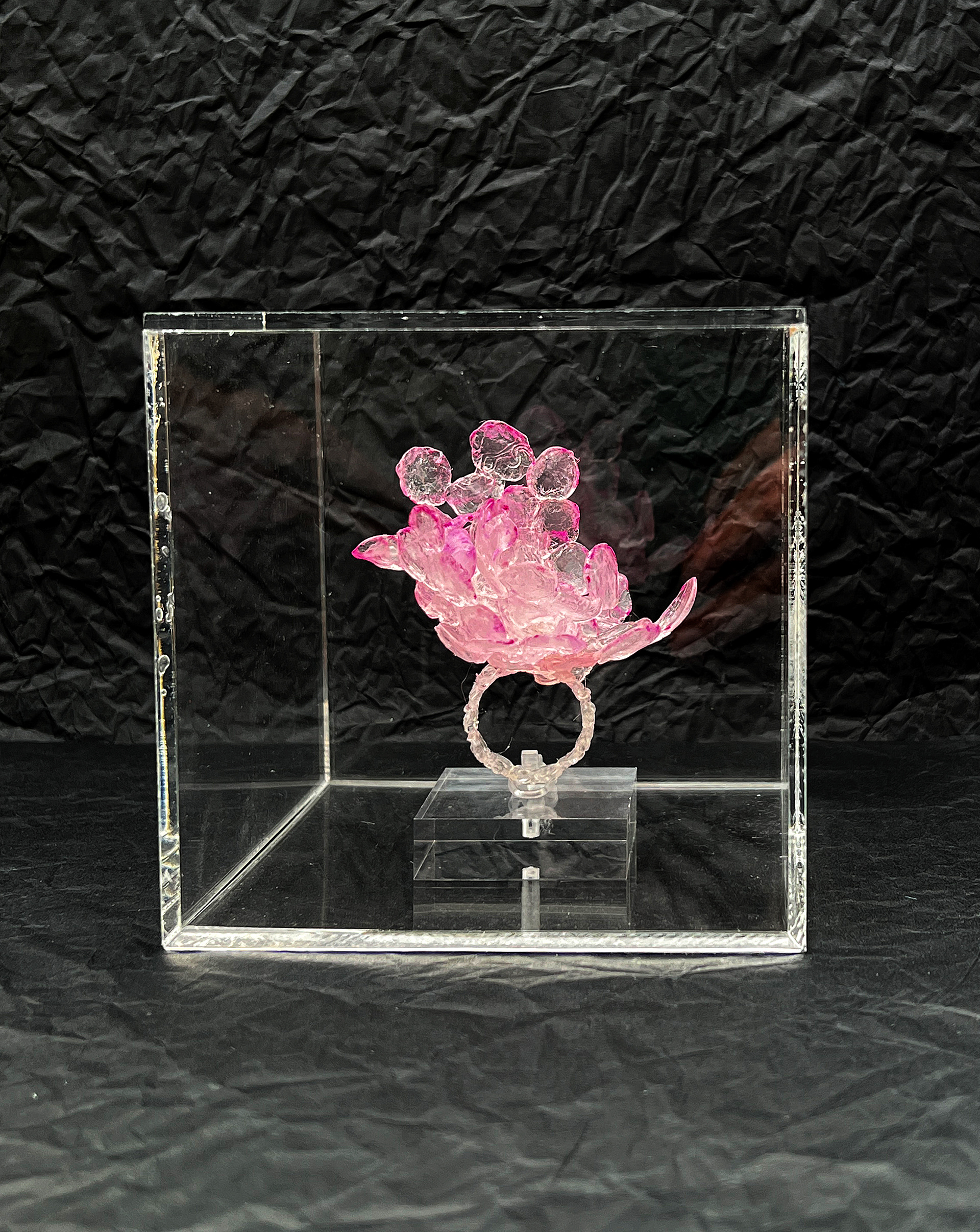 This is a series of rings, inspired by vulnerable coral structures. The rings are very fragile. In fact, They're even so fragile that you cannot wear it for a very long time. It reminds you of the vulnerability of the coral reef, our ecosystem, and the plastic soup in the oceans.