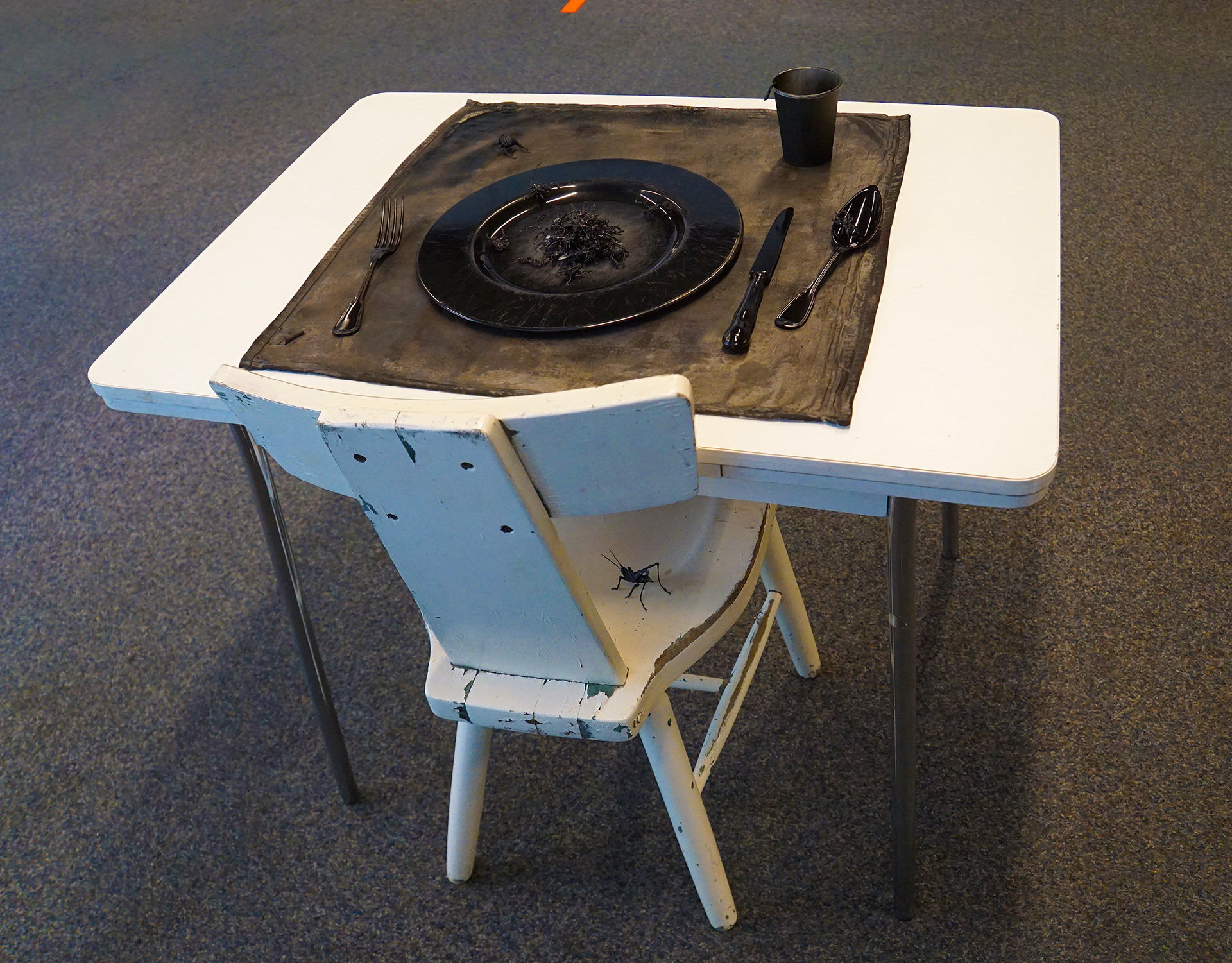 Mijn werk “Delicatesse” zoomt in op de toekomst van onze voedselvoorziening. We moeten eten om in leven te blijven, maar in de enorme schaalvergroting kunnen we niet blijvend voorzien. Insecten worden gezien als voedzame en duurzame oplossing. Ook lijkt men ervan overtuigd dat ziektes die insecten bij zich dragen nooit op mensen zullen overgaan. Uiteraard zullen we in staat zijn de gedaante van de insecten te veranderen voor ze op ons bord komen. We zullen ze verwerken in kroketten, chips en sausjes. In mooie ronde insectenburgers. En ook dan zullen we over het feit heenstappen dat we insecten in grote hoeveelheden zullen moeten kweken, willen we de vele hongerige monden blijvend kunnen voeden. De vraag is hoe wenselijk dit is, of dat we het probleem van de bevolkingsgroei beter op een andere manier aan kunnen pakken.