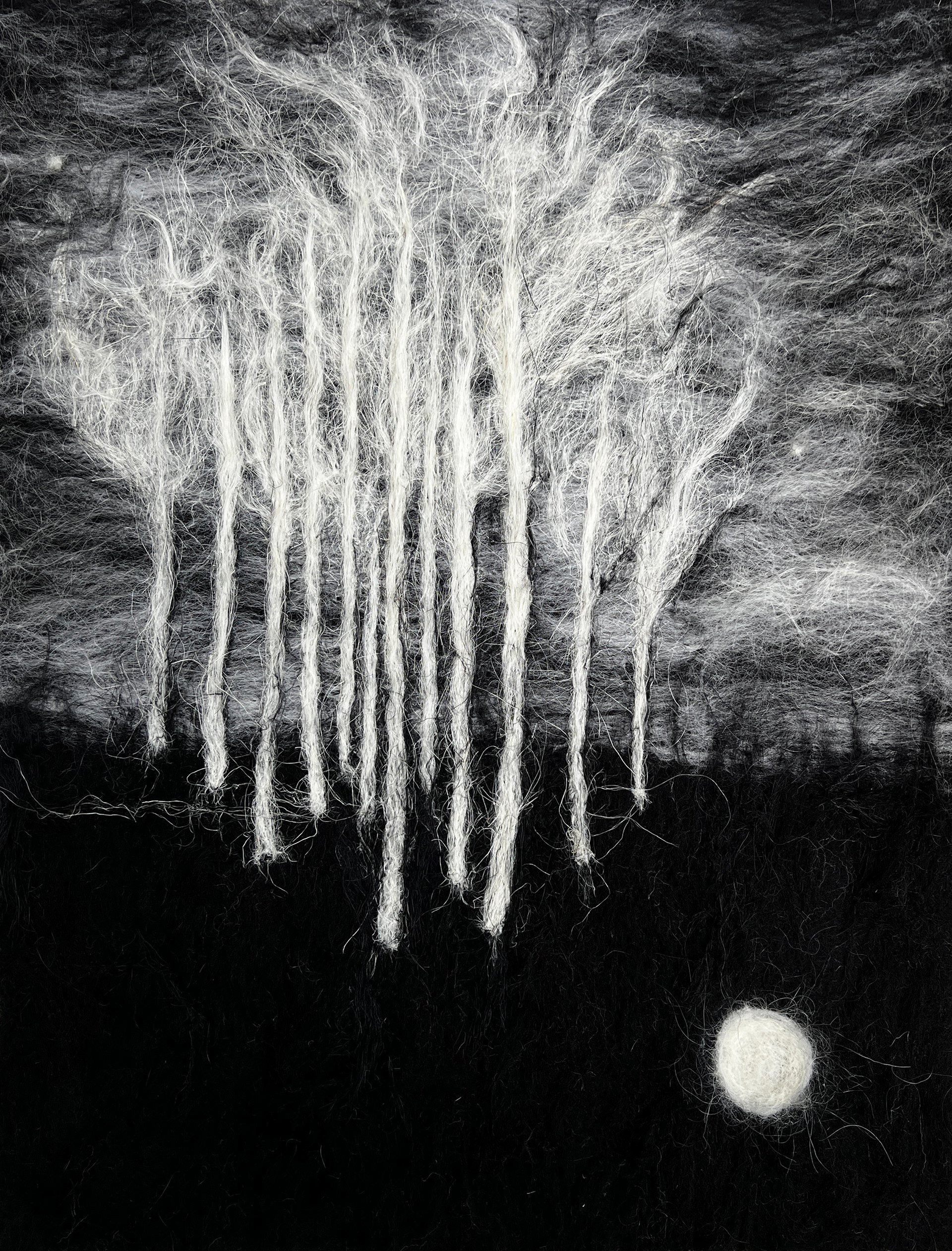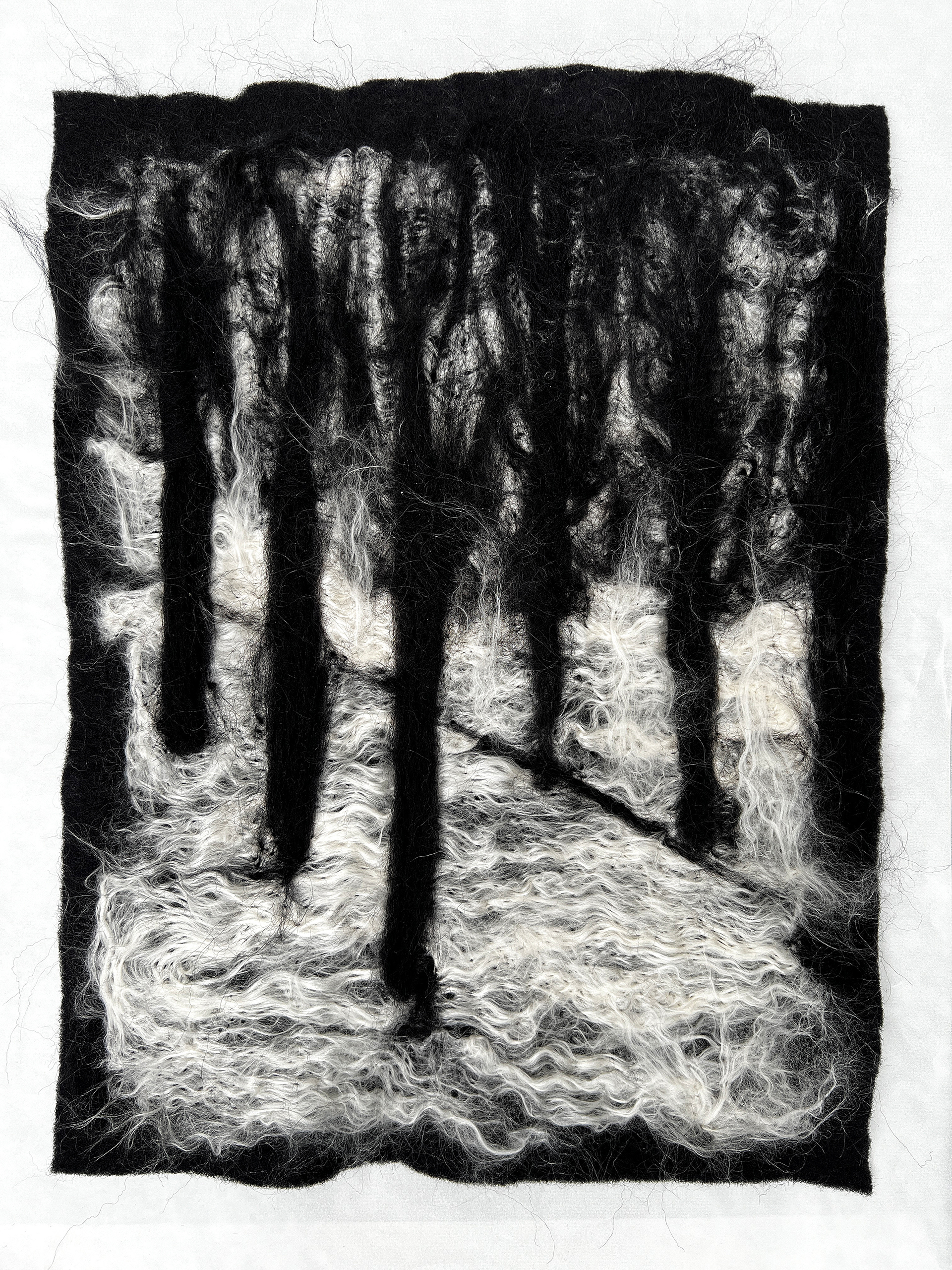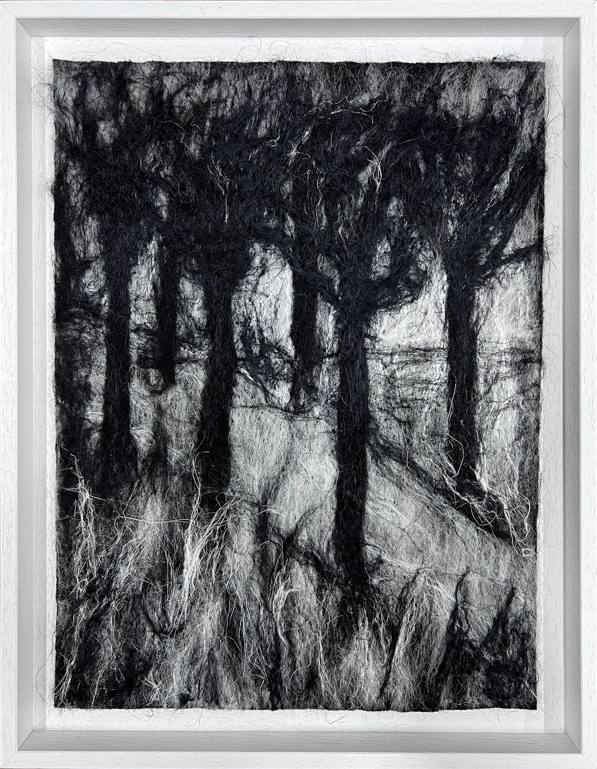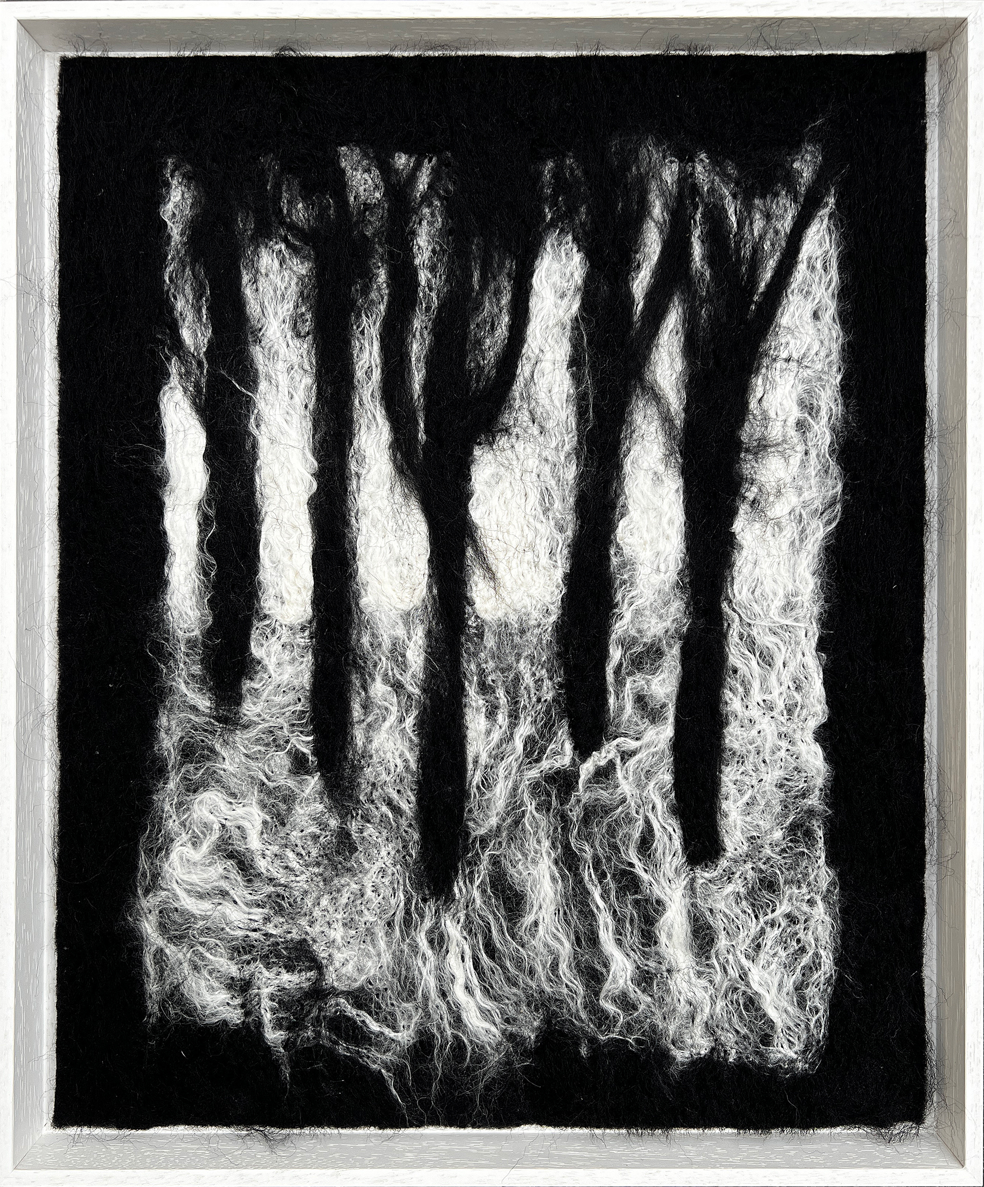 • Black Forest | felt, flax and Yak with Silk Roving | 40x50 cm. | in wooden frame, white, object list with reflective clear (museum) glass