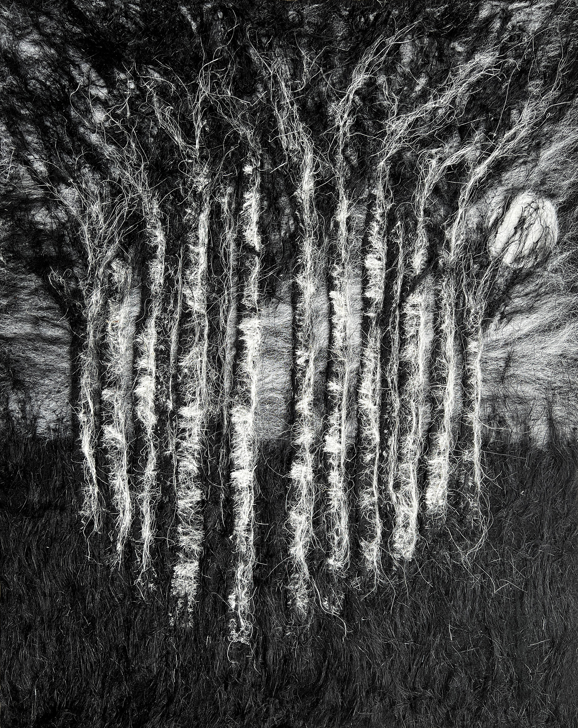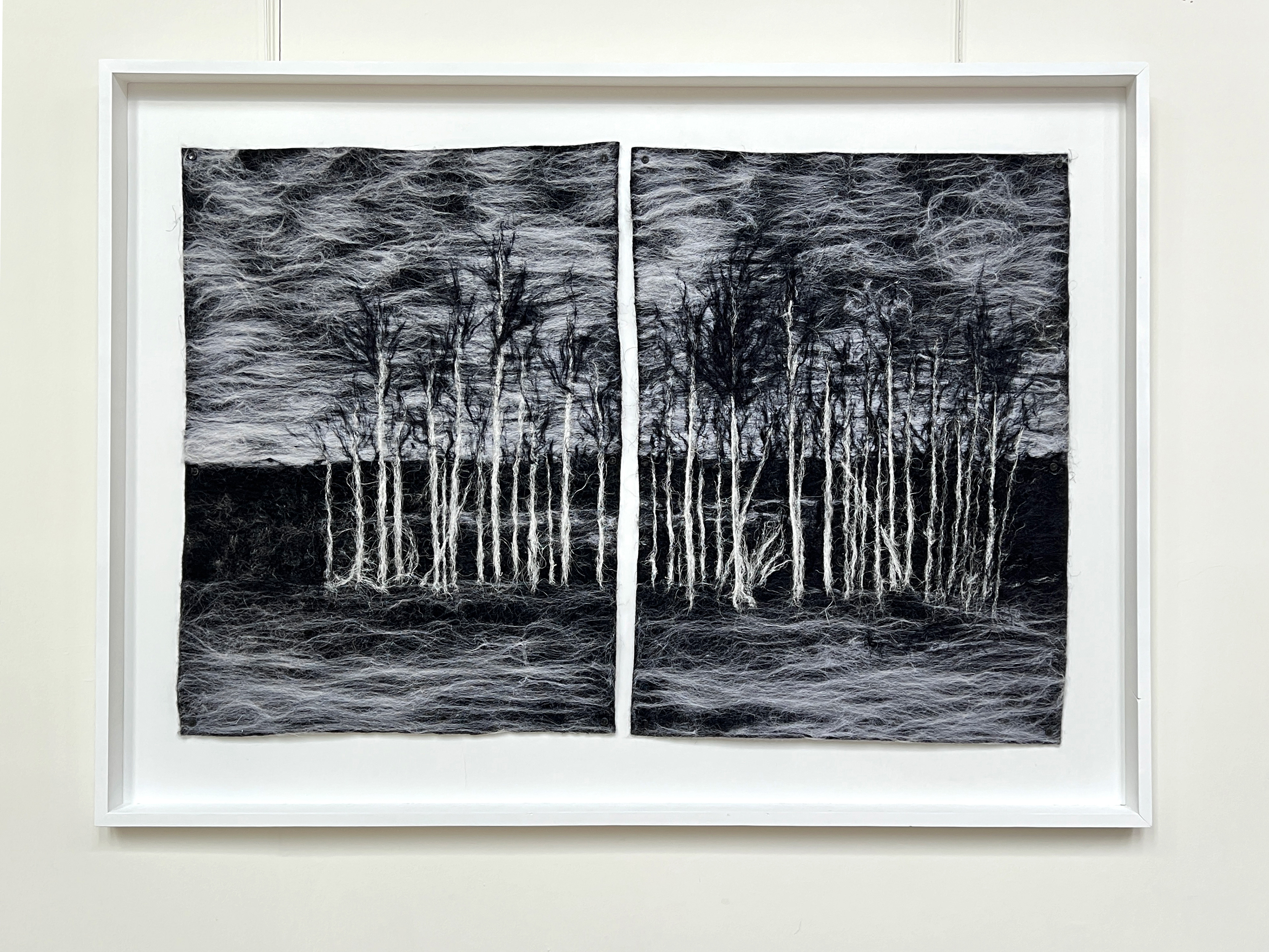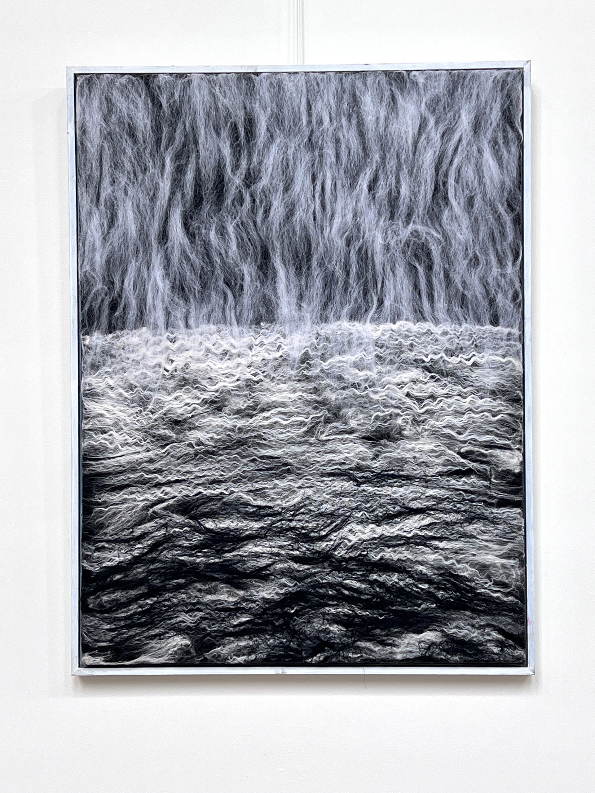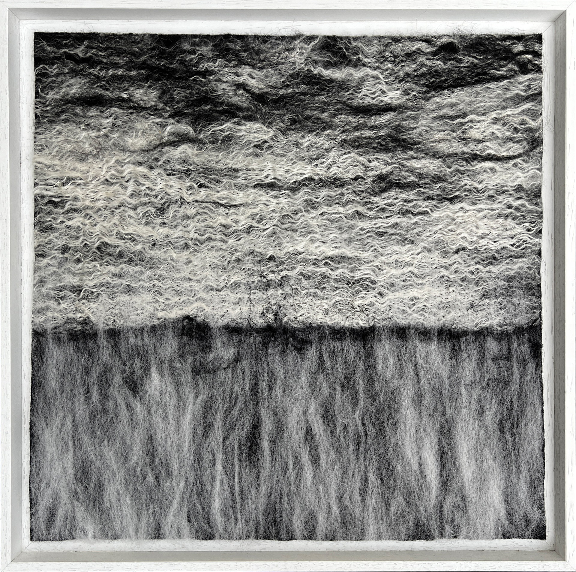 • Black Forest | felt, flax and Yak with Silk Roving | 40x50 cm. | in wooden frame, white, object list with reflective clear (museum) glass