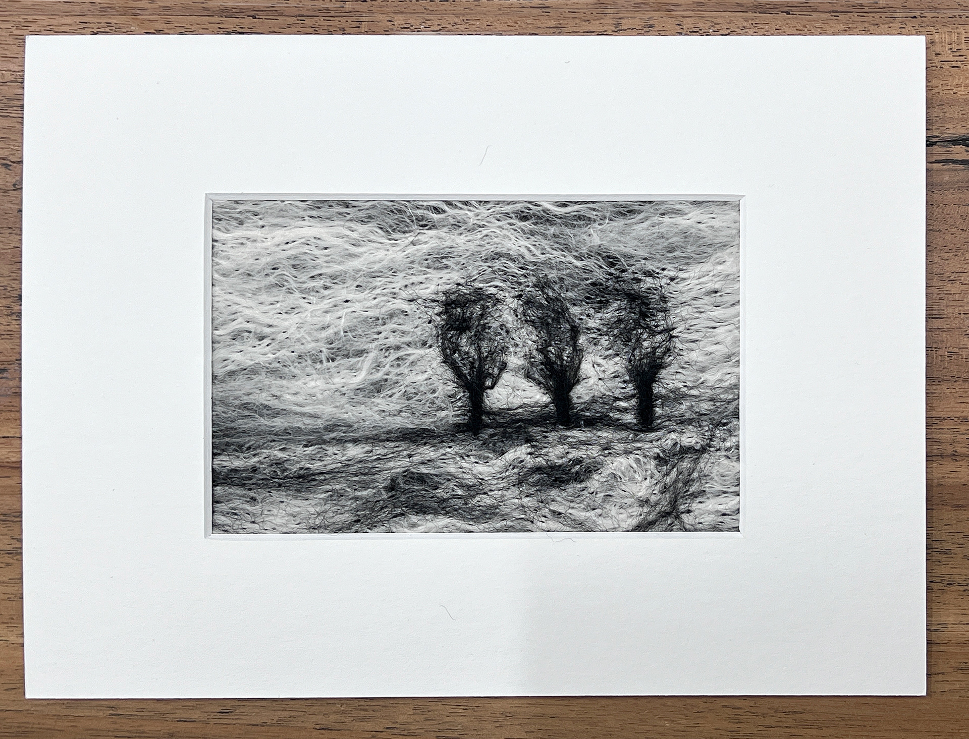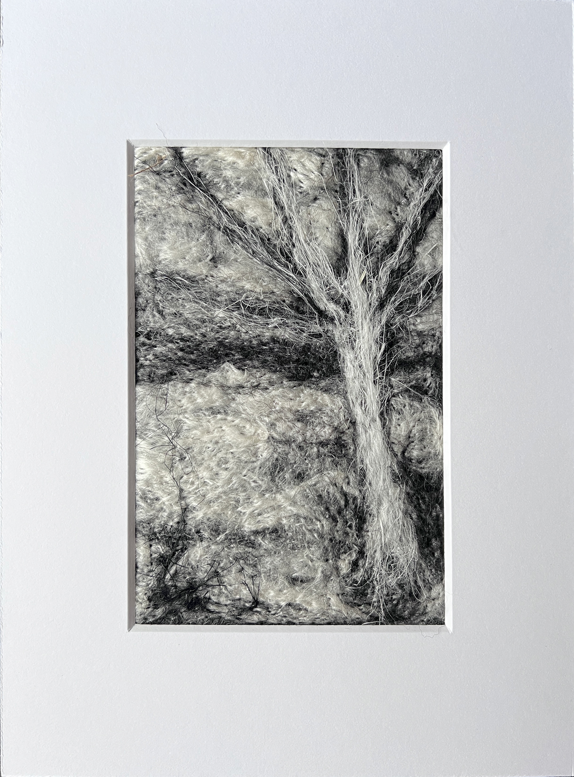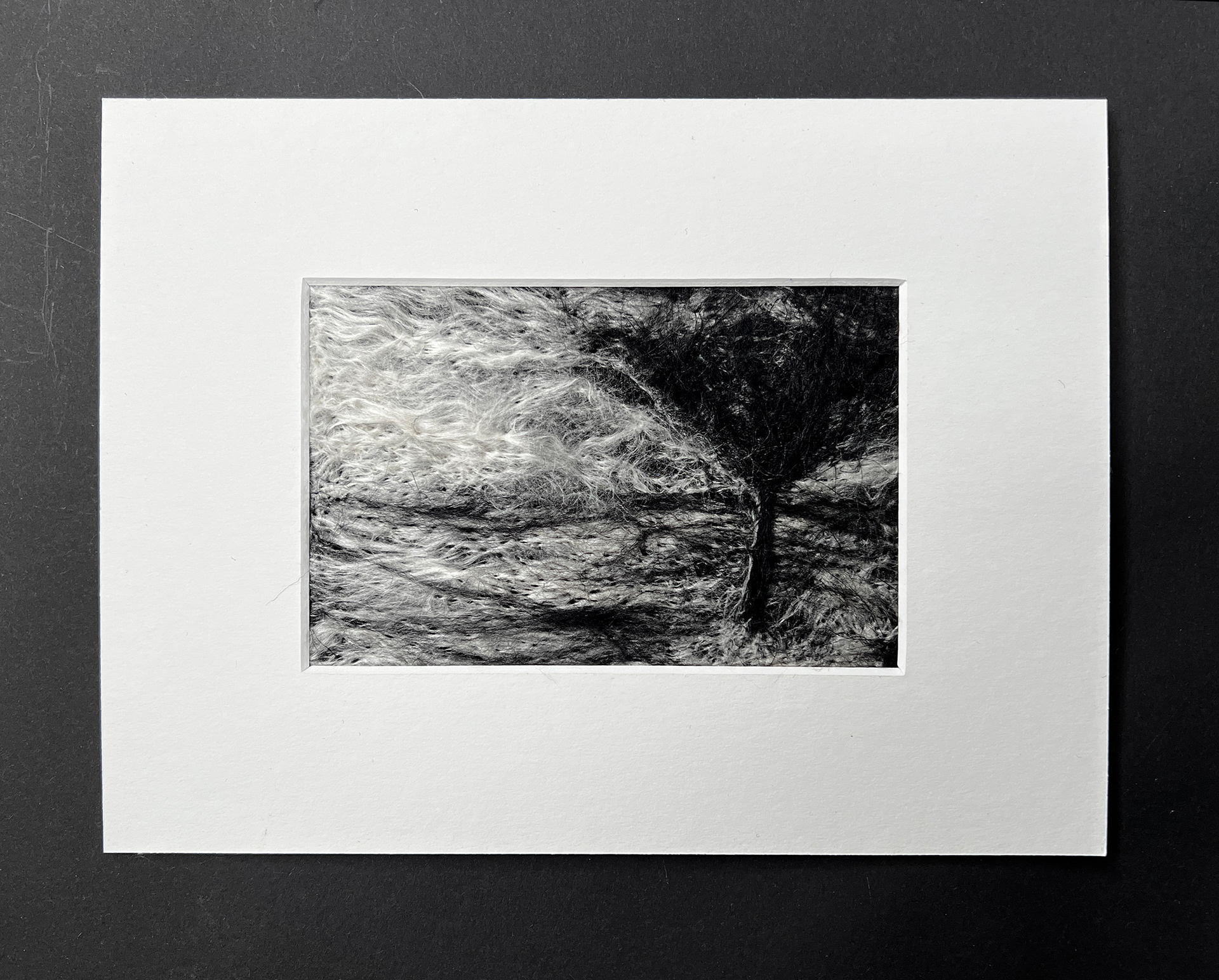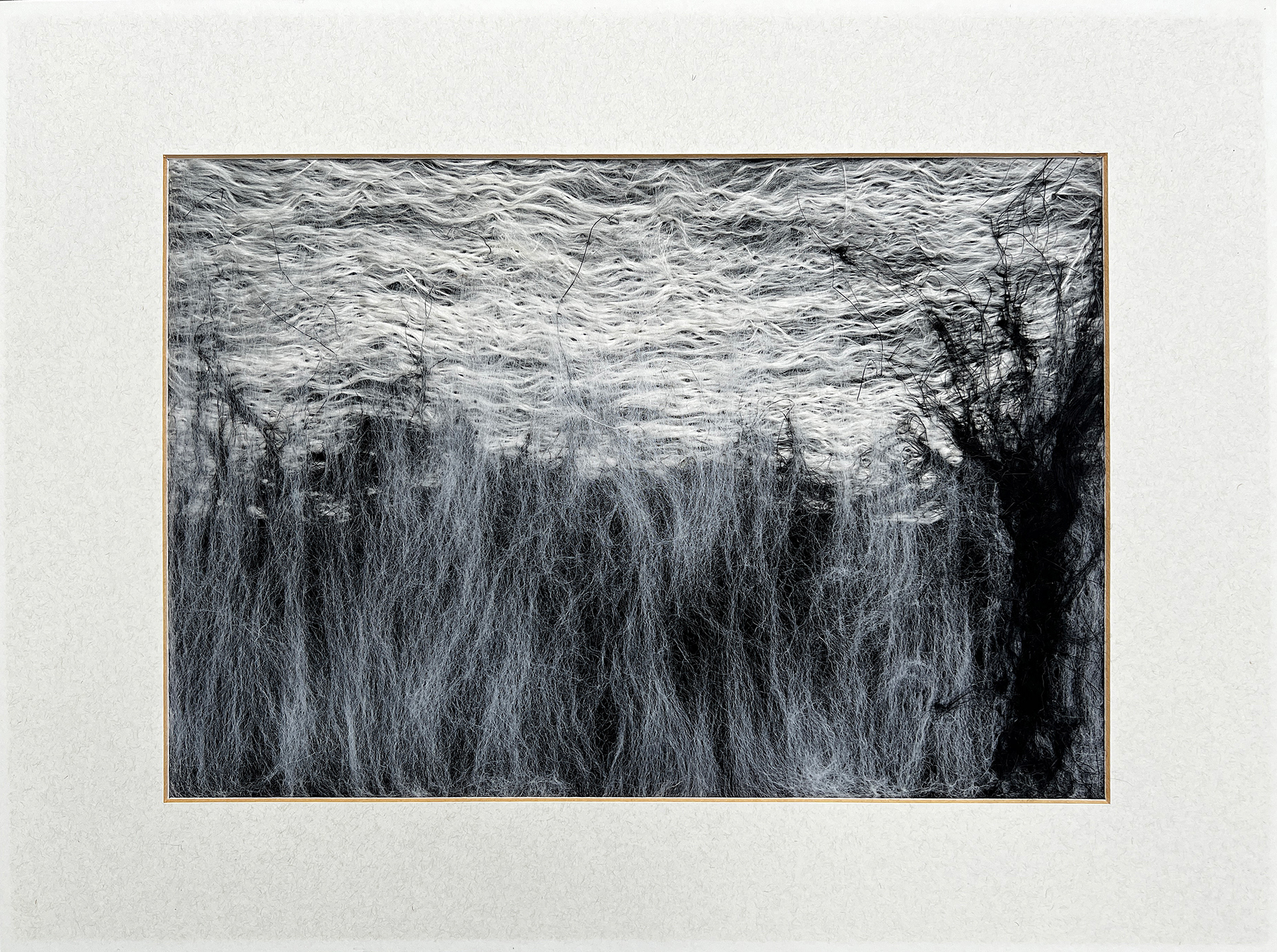 • Black Forest | felt, flax and Yak with Silk Roving | 40x50 cm. | in wooden frame, white, object list with reflective clear (museum) glass