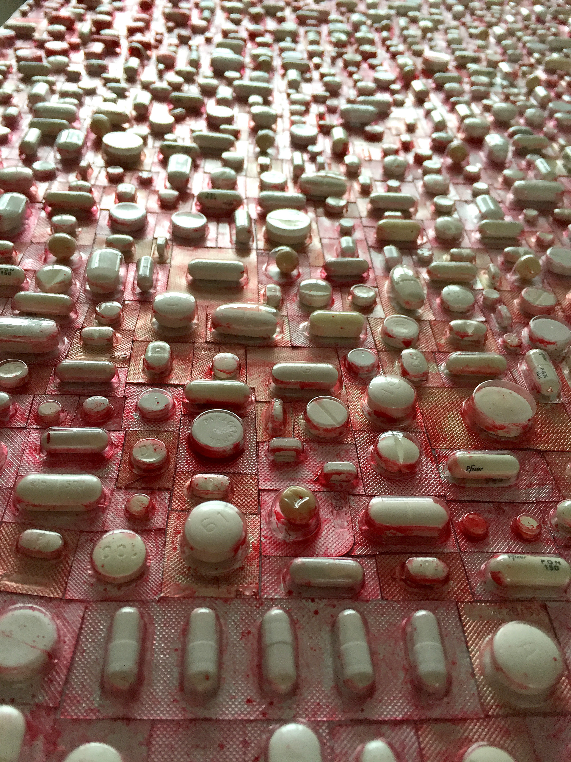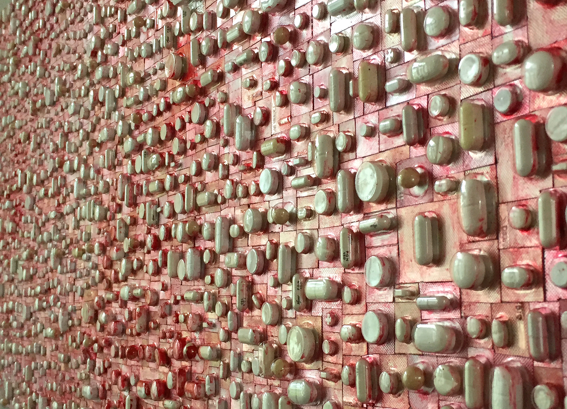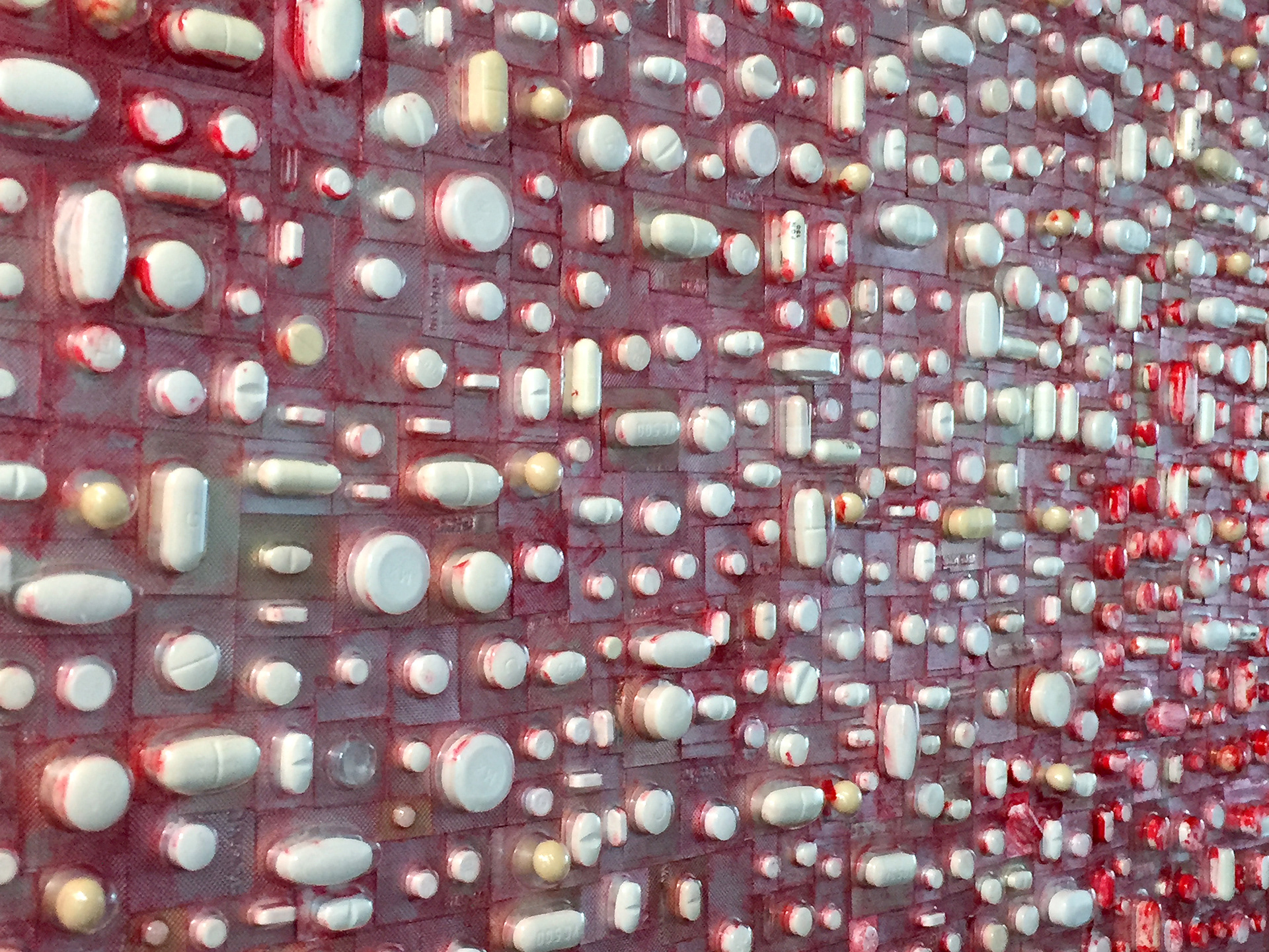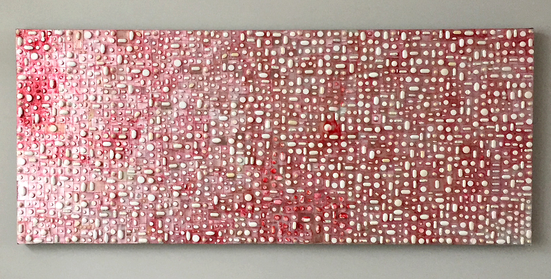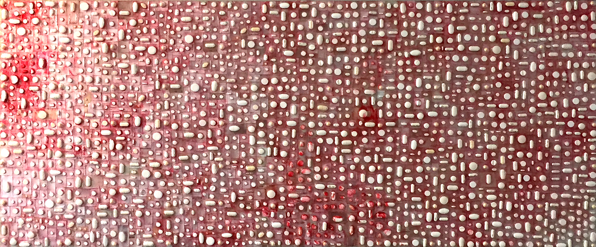 LIFELINES | Over maakbaarheid en het leven | Collage van witte pillen, beschilderd | 50 x 120 x 3 | Mixed media on canvas | © 2018 | Verkocht
