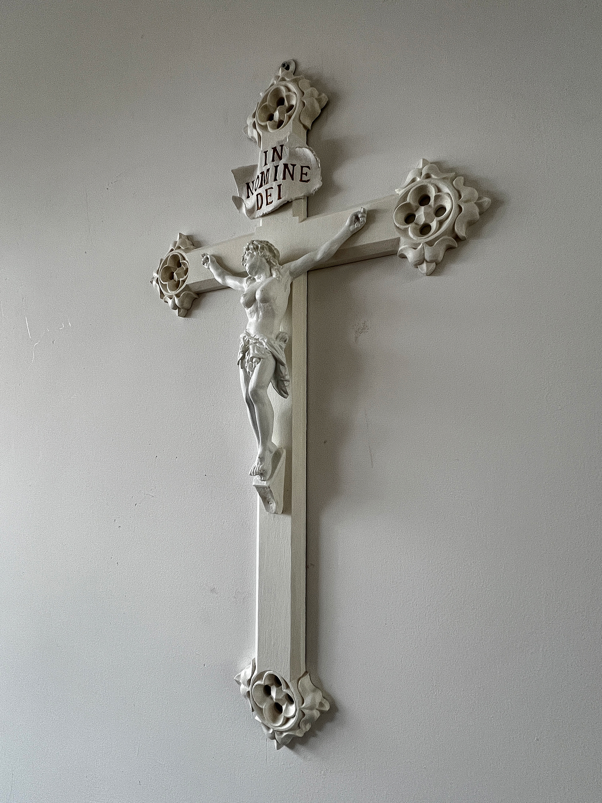 Bij “In Nomine Dei” (Uit naam van God) heb de Christusfiguur getransformeerd van man naar vrouw. Valt het op, eigenlijk niet toch? Er hangt vooral een mens. (ik heb dit werk buiten de tentoonstelling in de museumgangen laten hangen, waar het een onopvallende rol speelt, die deze aanname bevestigt).