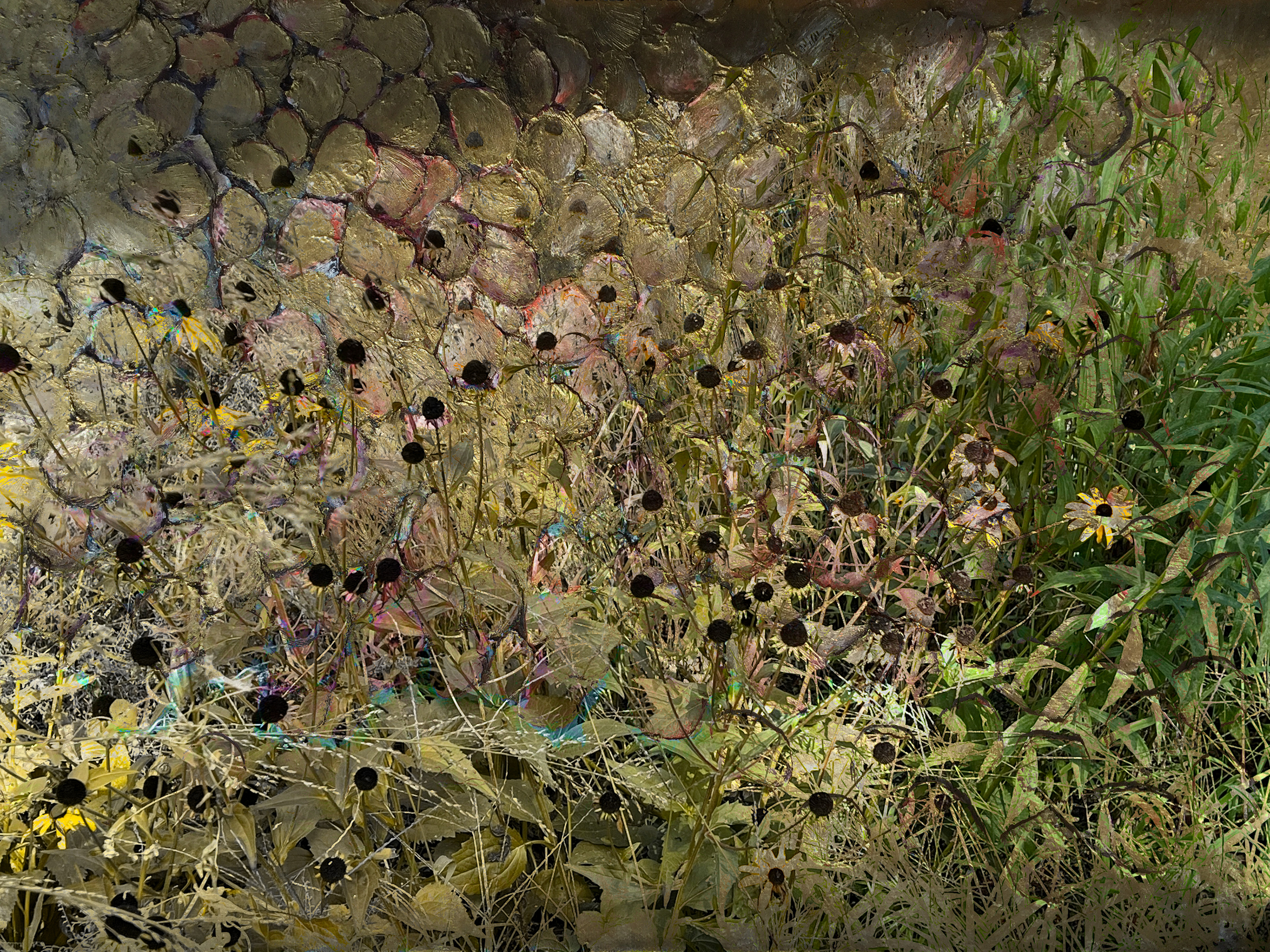 Fotomontage met kleurbewerking in zwarte baklijst | Ruwe structuur, mat papier van Hahnemühle | dit werk was eerder te zien tijdens de Klimaatexpo'22, museum de Fundatie, kasteel Nijenhuis. Ook beschikbaar: verlijmd op dibond (ingelijst zonder rand).