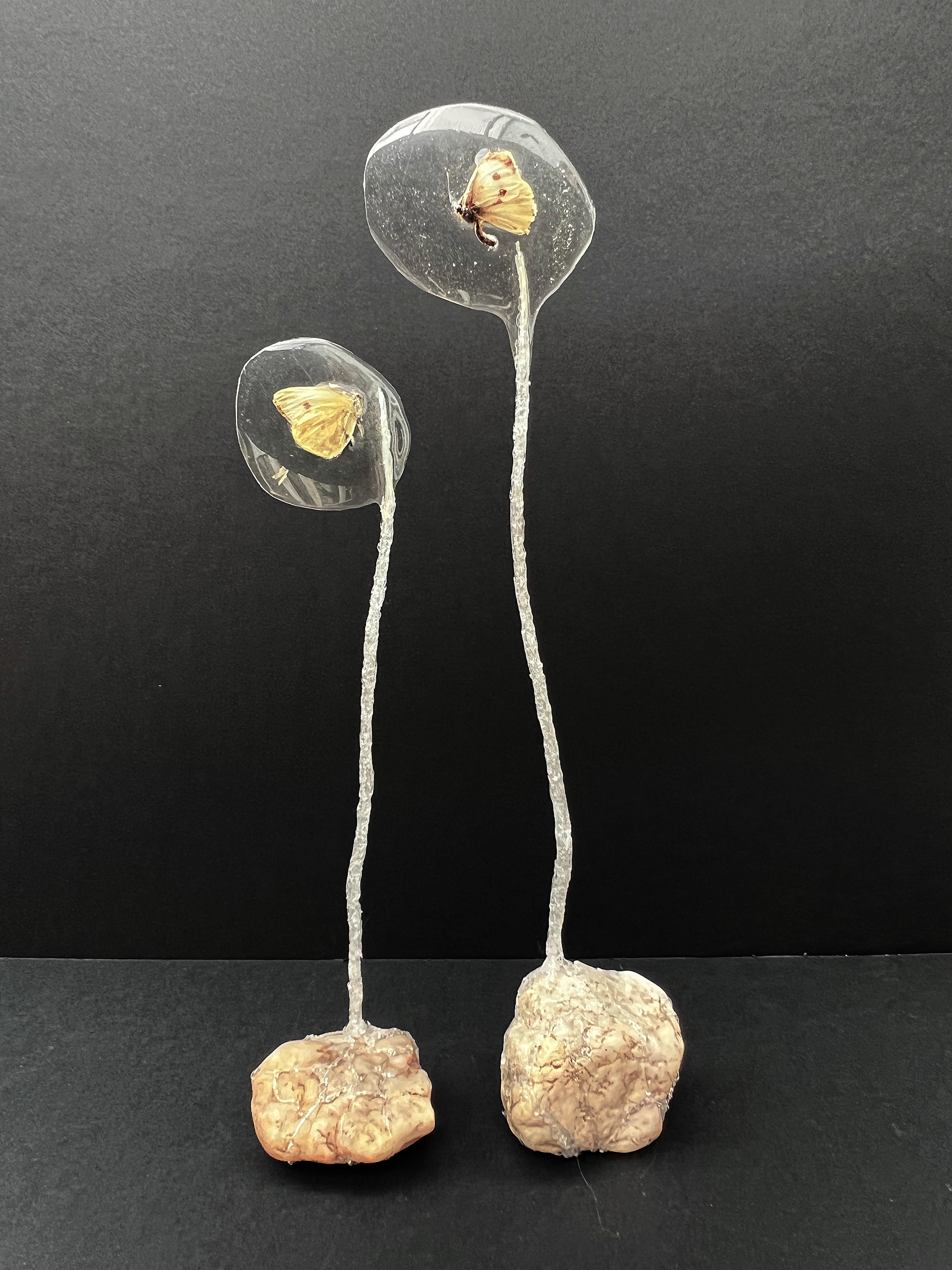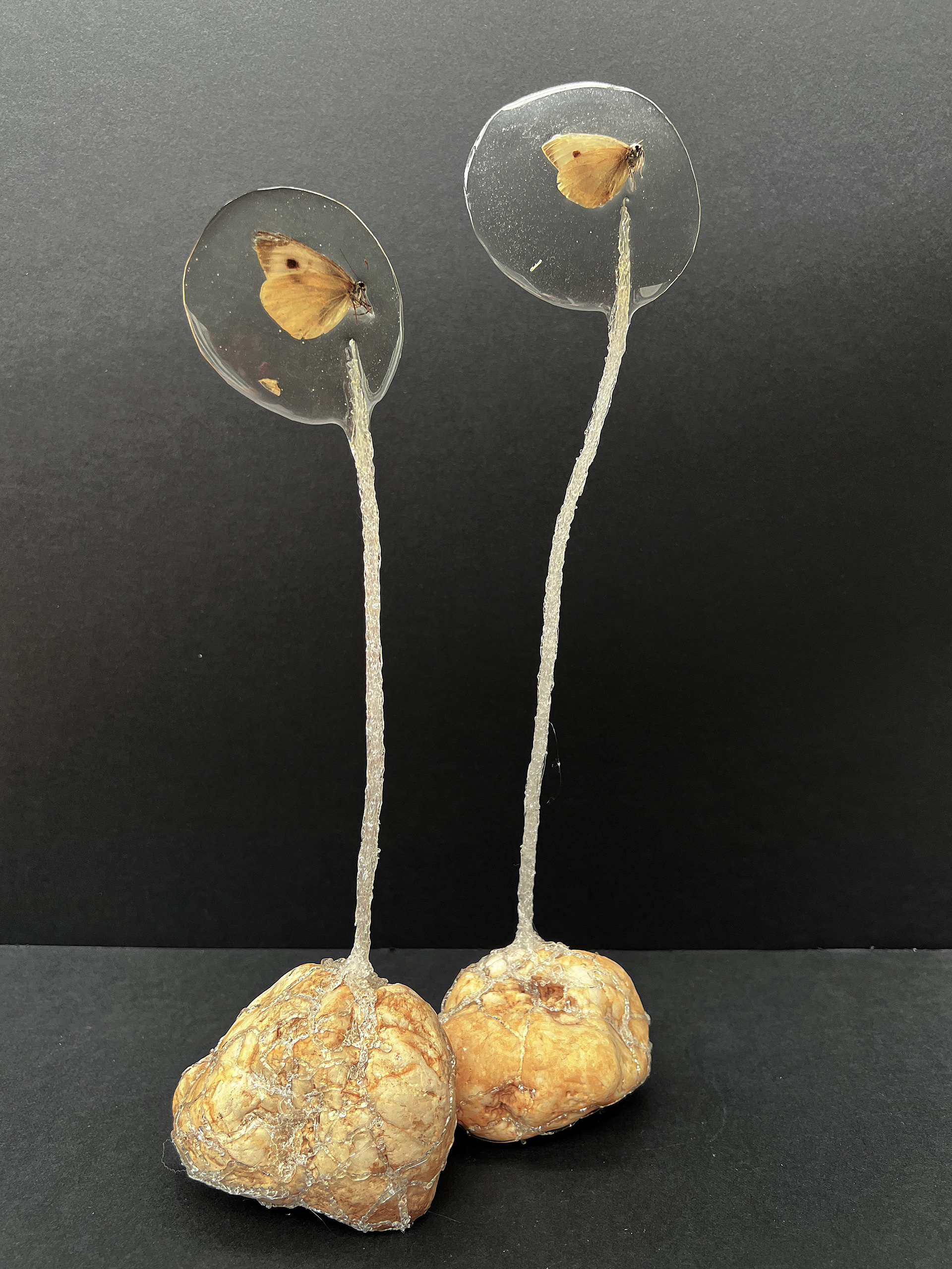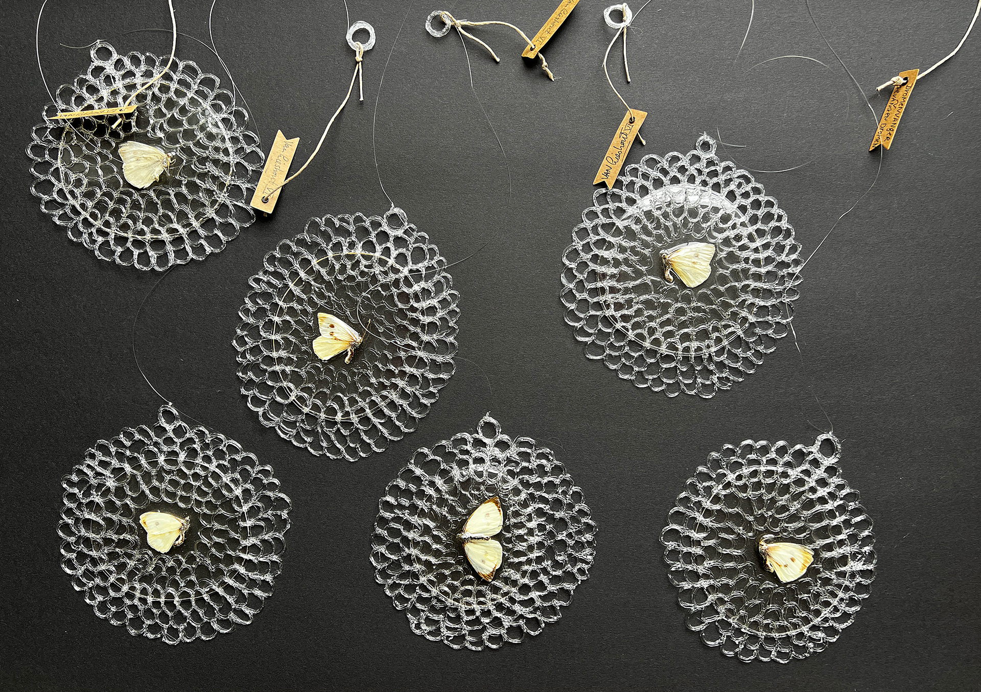 Naast de installaties met vlinders heb ik kleine objecten gemaakt met vlinders, boskeien, epoxy en PLA (bioplastic).
