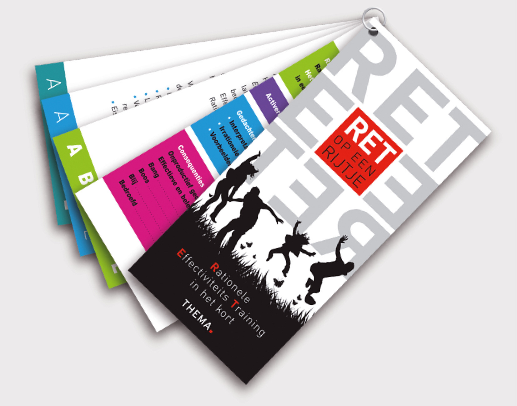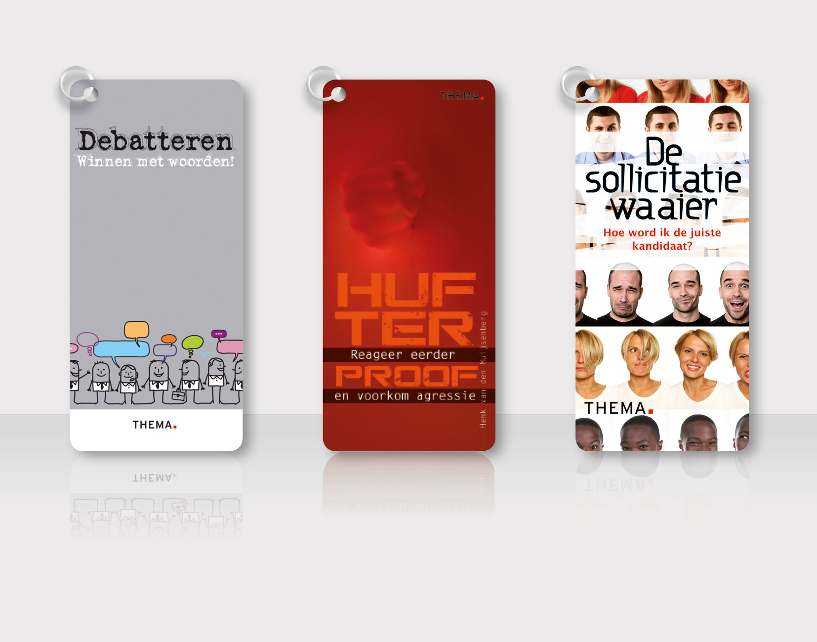 Voor uitgeverij THEMA (Zaltbommel) maakte ik waaiers voor diverse auteurs en met verschillende onderwerpen. THEMA is een gespecialiseerde uitgeverij die zich richt op het verbeteren van het persoonlijk functioneren van mensen, met name mensen in werksituaties.